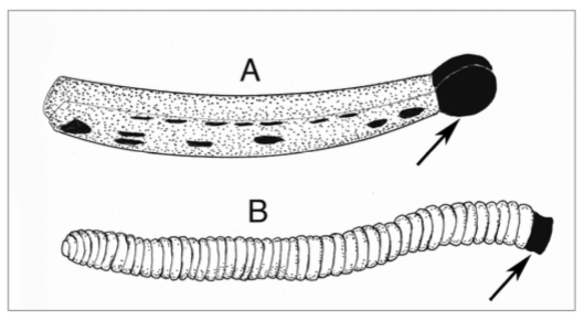 Illustration 1 : A-Pollinarium appartenant au genre Cylindrocites ; B-Pollinarium appartenant au genre Annulites – Les flèches désignant les viscidies (Source : Poinar, 2016)