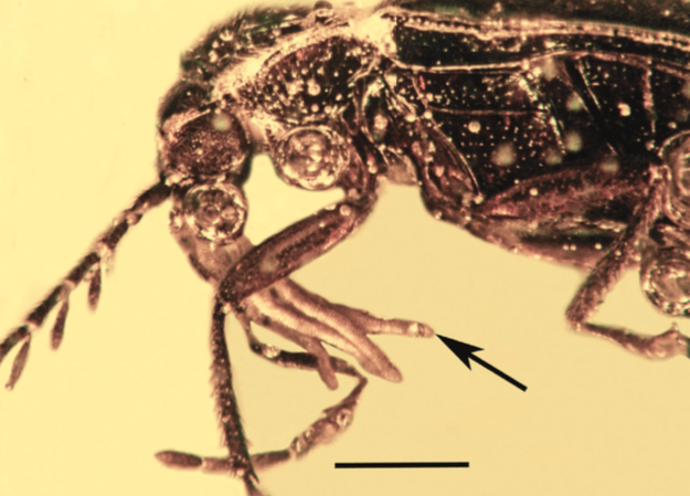 Photo 1 : Vue latérale du charançon fossile où sont attachées les pollinies appartenant au genre Cylindrocites (Source : Poinar, 2016)Photo 2 : Pollinies appartenant au genre Annulites attachées aux pièces buccales du coléoptère Ptilodactylidae (Source : Poinar, 2016)