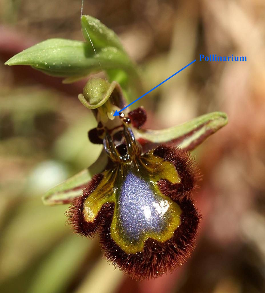 Les orchidées sont des plantes extraordinaires qui ont développé une stratégie unique de dispersion du pollen. Ces grains sont regroupés dans de petites capsules (les pollinies), recouvertes de bandes adhésives (les viscidies), fixées à un support (les caudicules) : l’ensemble de cette structure forme le pollinarium.