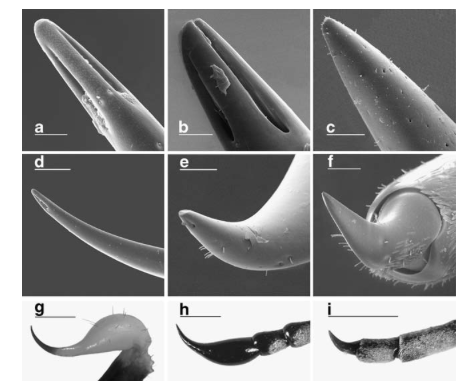 A l’aide d’observations au microscope électronique à balayage, les scientifiques on pu décrire et étudier ces organes. Il s’avère que le système de distribution du venin est quasi-similaire à celui des organes à venin situés à l’extrémité de la queue des scorpions de la famille des Buthidae.