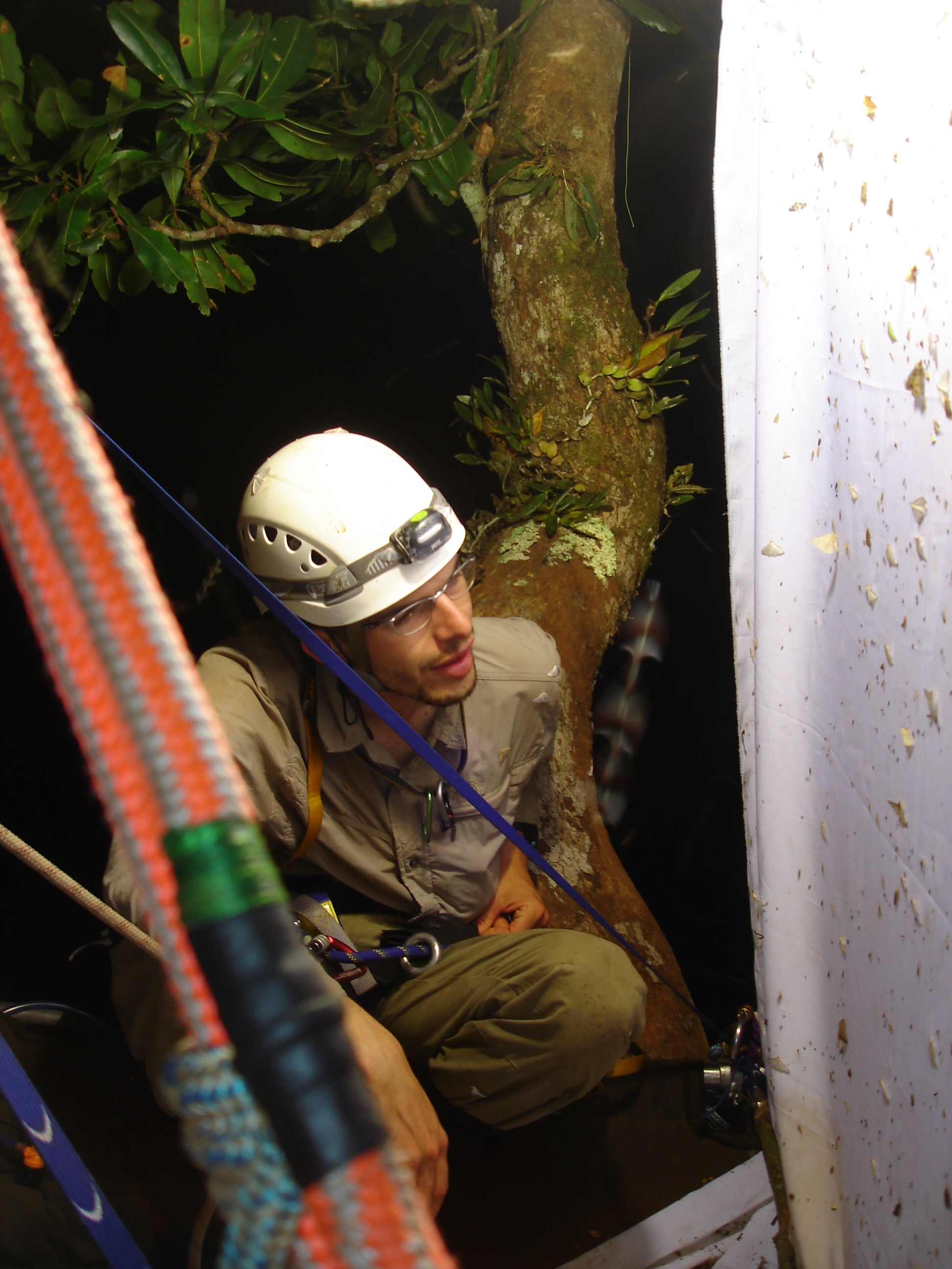 Nicolas Moulin à la recherche de mantes dans la canopée – Expédition Sangha – RCA – 2010 (Source : N. Moulin)